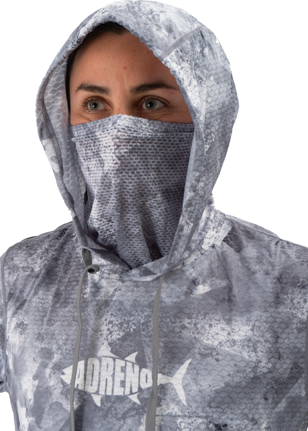 Adreno Hooded Boat Shirt – Light Grey Camo – Built for spearos who demand lightweight coverage and full protection during long days on the water. The Light Grey Camo blends well with rocky, reefy, and overcast coastal environments. The integrated face buff and hood shield you from UV, wind, and surface glare, while the breathable quick-dry fabric keeps you comfortable between dives. The product images highlight the fitted hood, mesh gaiter, thumb-loop sleeves, and durable hex-texture material.